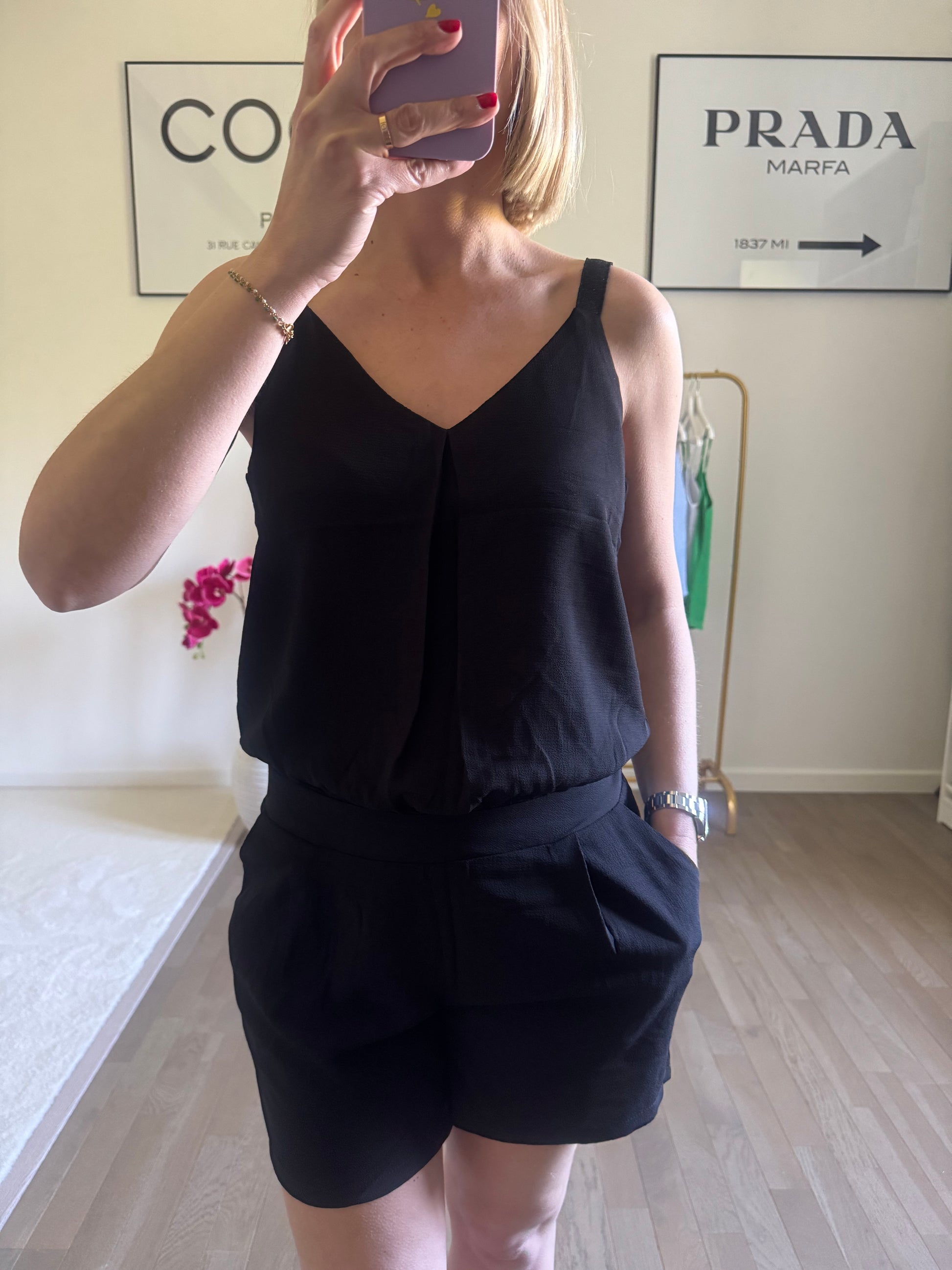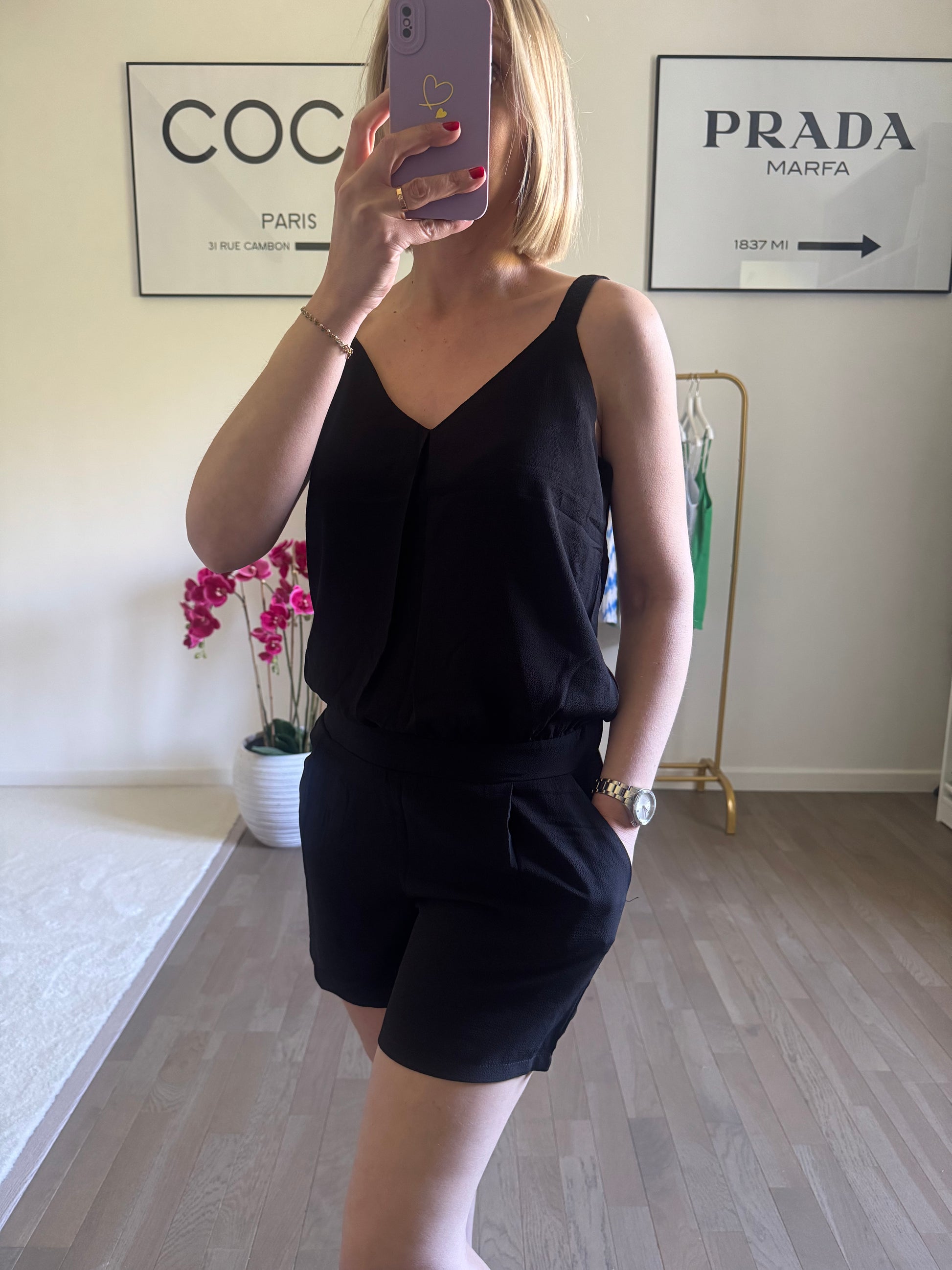 Cette combinaison noire élégante et légère est parfaite pour toutes vos journées ou soirées. Le short vous offre une grande liberté de mouvement, tandis que sa couleur noire vous assure une allure élégante. Idéale pour toutes les occasions, elle ajoutera une touche de sophistication à votre garde-robe.