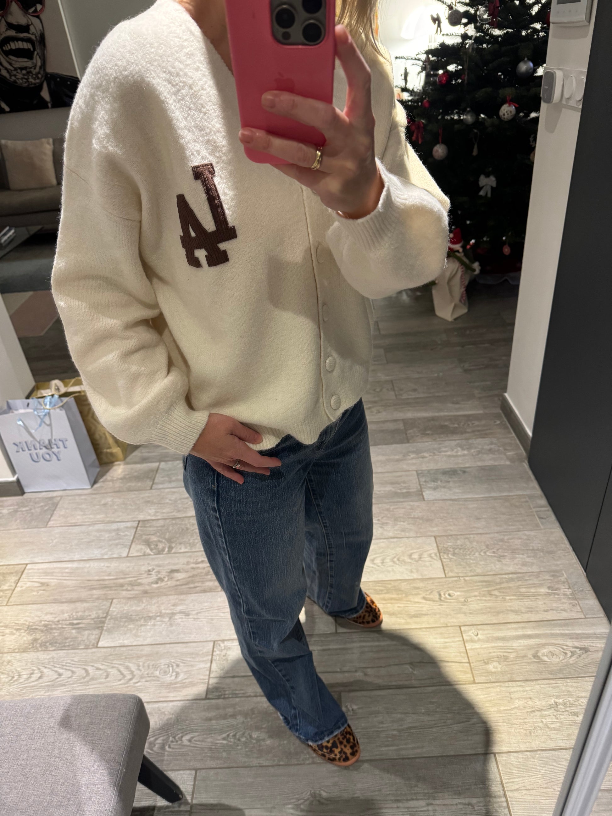 Gilet épuré en beige naturel, orné d'inscriptions « LA » en velours chocolat pour une touche de caractère.