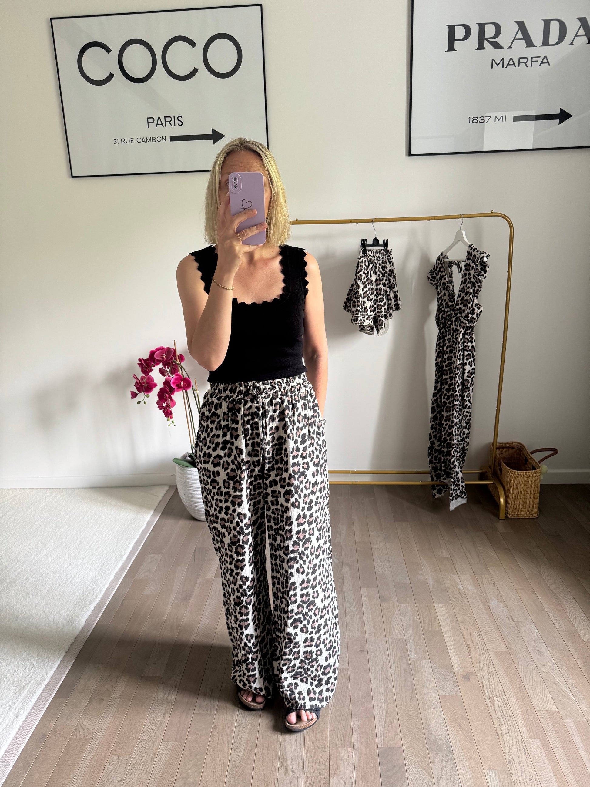 Découvrez le pantalon Lily en gaz de coton léger, orné d’un motif léopard élégant. Sa taille unique assure un ajustement confortable et facile à porter au quotidien.