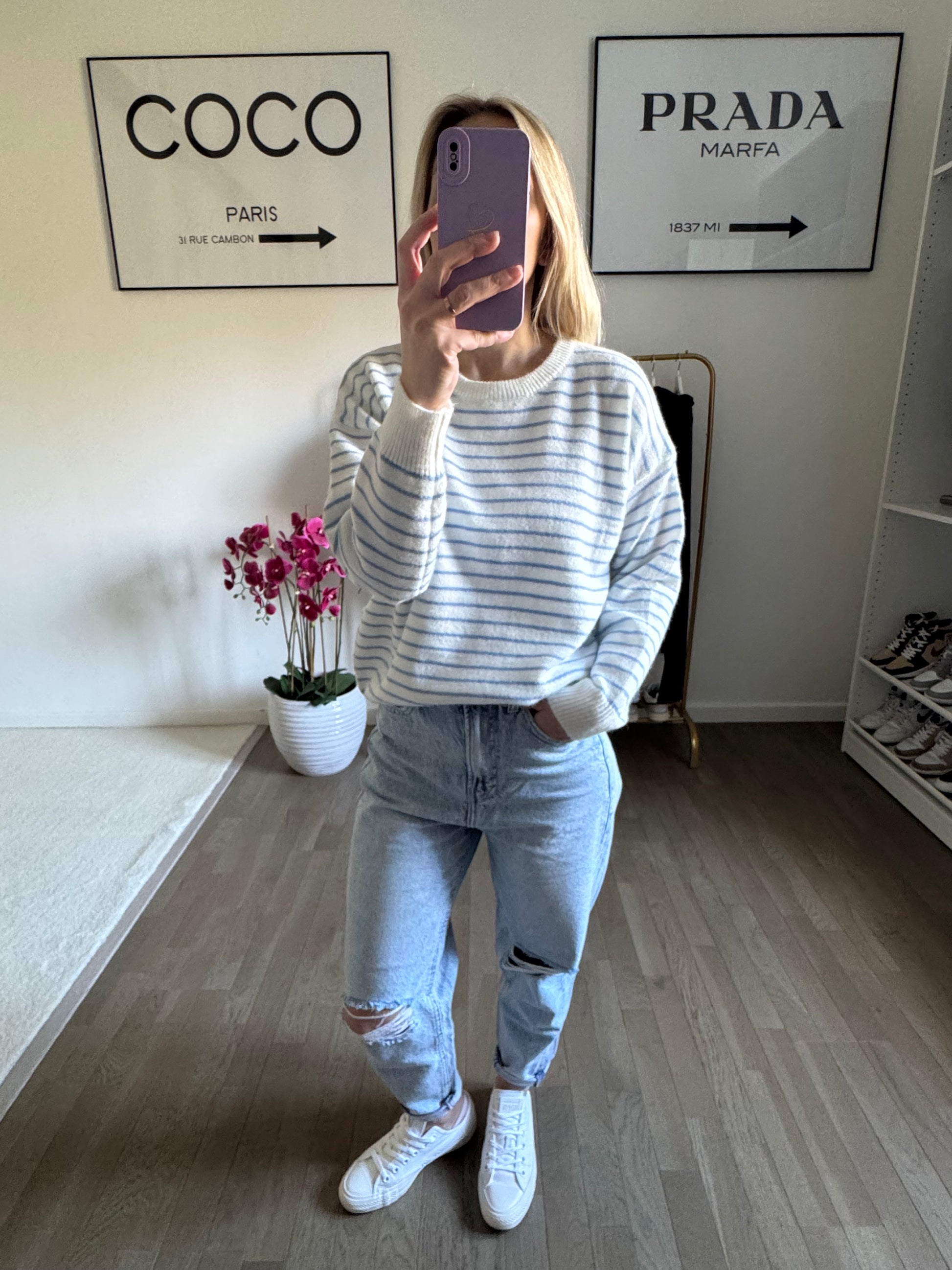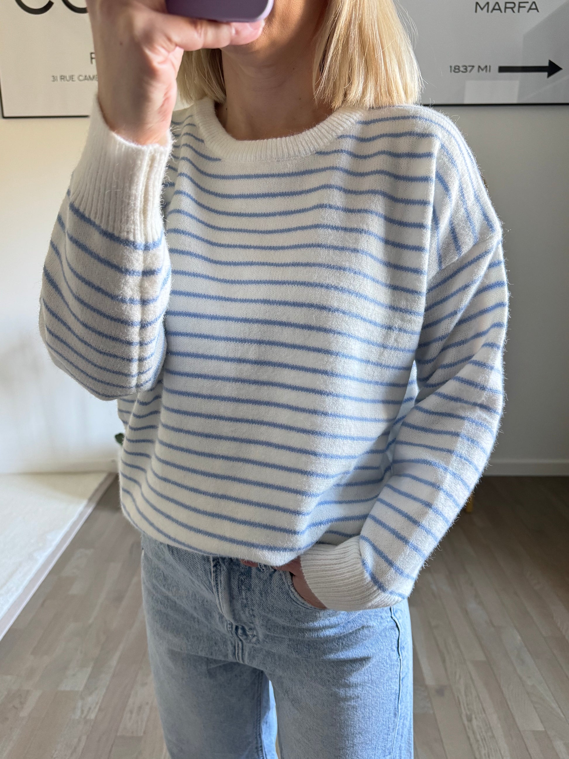 Ce pull marin est un indispensable pour votre garde-robe. Avec ses rayures blanches et bleu ciel, il mettra en valeur votre style.
