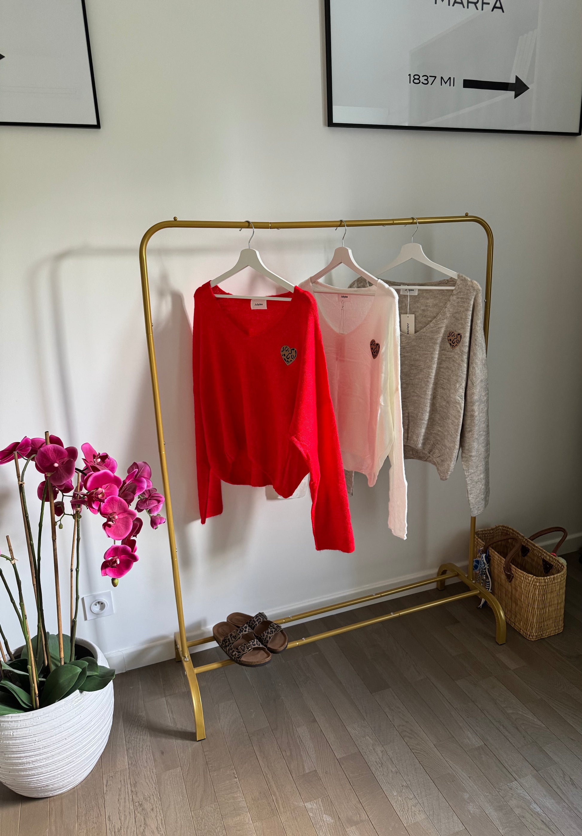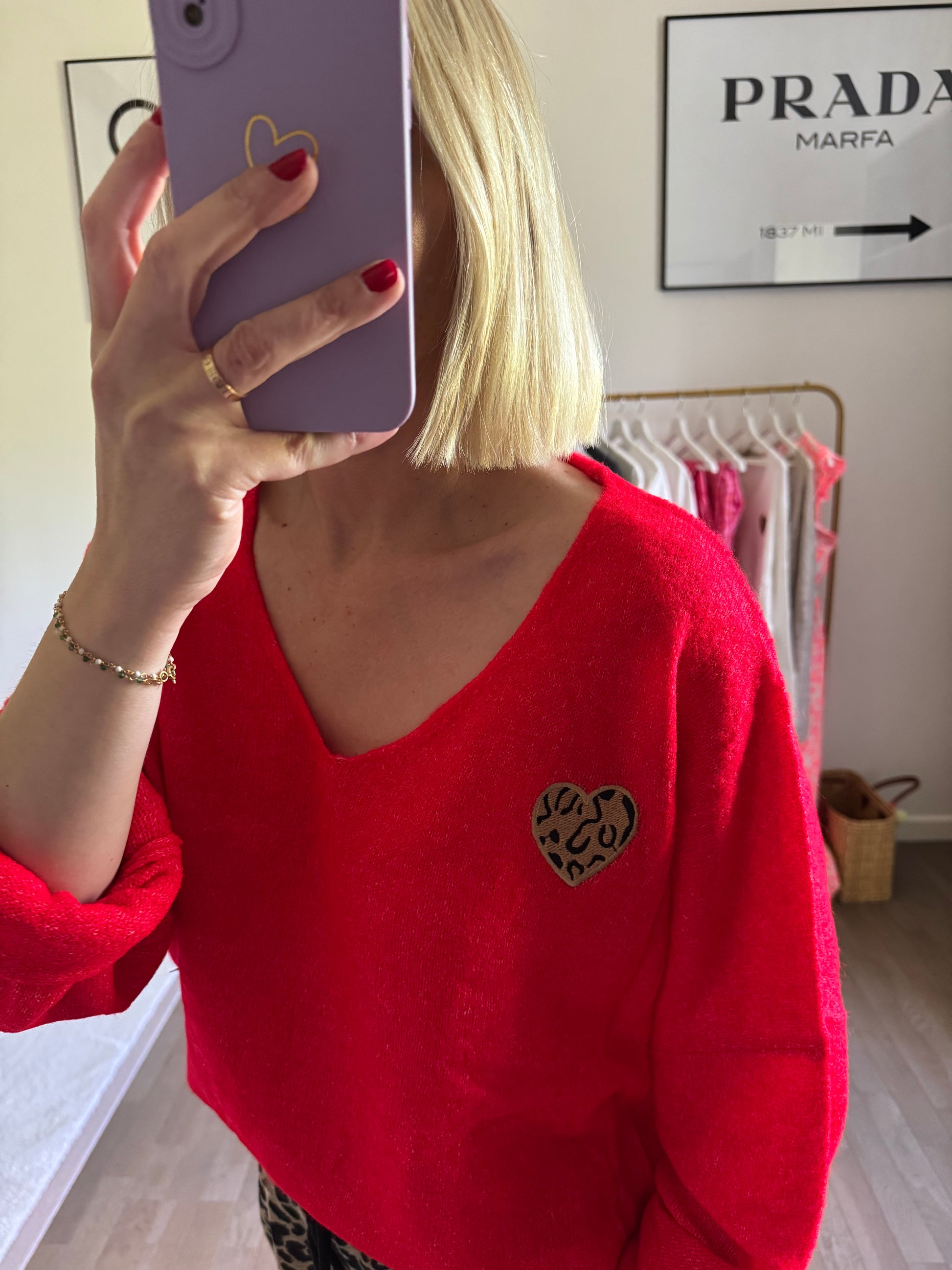 Ajoutez une touche de style à votre garde-robe avec notre pull léger Ana. Le col en V met en valeur votre silhouette tandis que le petit coeur léopard apporte une touche de fantaisie. Disponible en rouge, blanc ou beige, ce pull vous offrira confort et élégance.