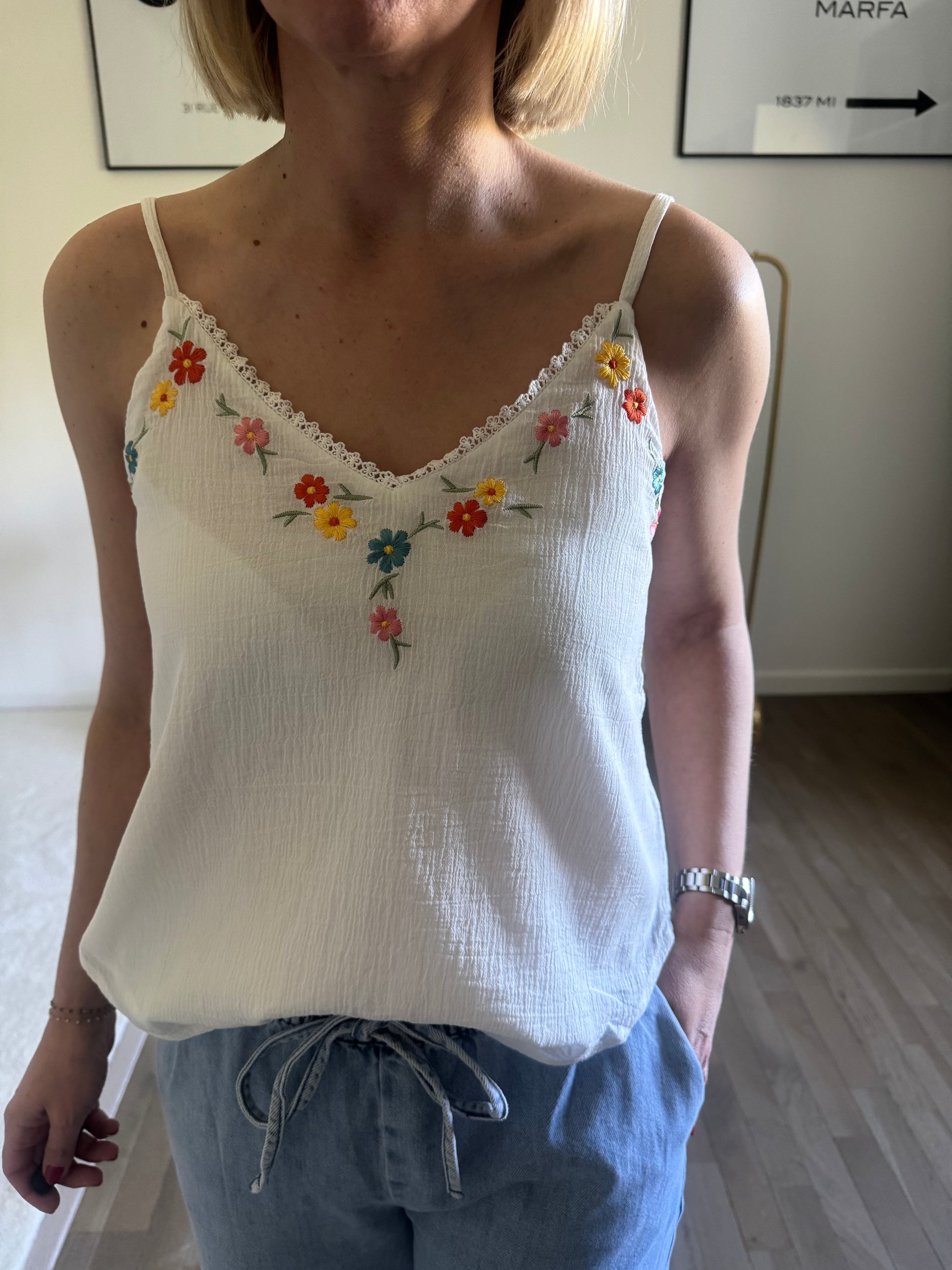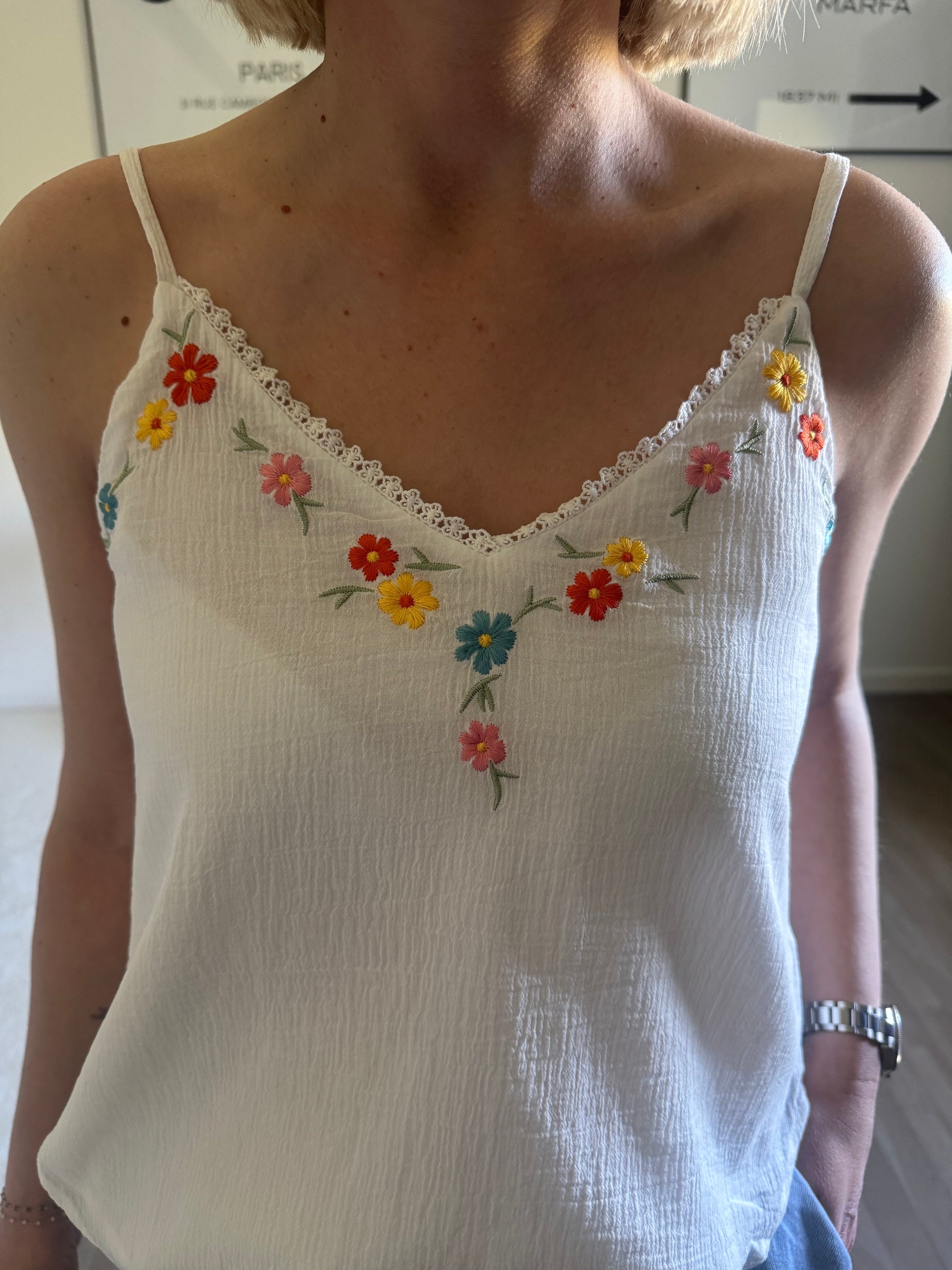 Le Top Aube en gaz de coton avec ses es bretelles réglables offrent un ajustement parfait. Les fleurs brodées apportent une touche de délicatesse à votre tenue. Confortable et fluide, ce top vous gardera au frais tout en vous donnant un style élégant.